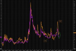 Tras la conferencia del CEO, se ha empezado a rastrear el mercado en busca de indicios sobre su teoría y, por el momento, en Market Ear ya publican que el VIX muestra un spread que podría considerarse como inicio de complacencia frente al virus. Se trata de los caminos opuestos que están mostrando el VIX ( ver post APP Aston Dealers® sobre análisis VIX Doble techo) y el VVIX, que mide la volatilidad propio índice.