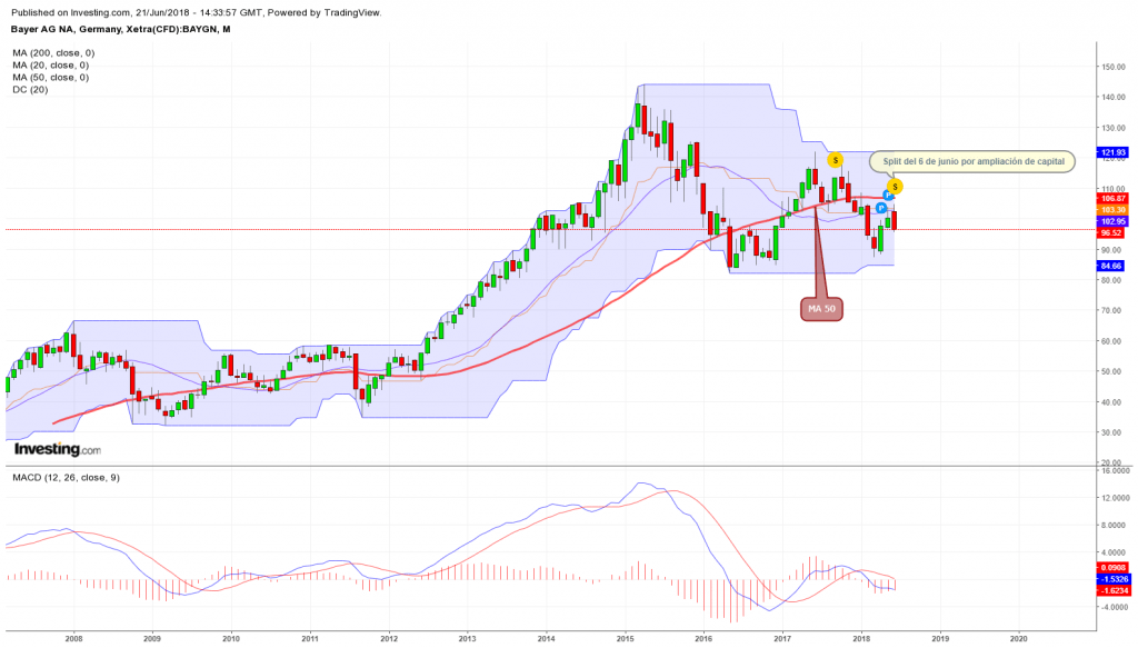 Como se puede comprobar la última vela es de color rojo, este mes de Junio ha sido bajista, muy probablemente porque la inversión realizada por Bayer en la compra de Monsanto haya sido por la parte económica cuando menos cuantiosa, pueden influir el negativismo de algunos inversores accionistas de la compañía que no les haya gustado tanto esta operación corporativa-financiera, pero en el largo plazo la previsión es más bien positiva pues la cotización se ha movido dentro del triángulo (color azul) rebotando en la resistencia y en el soporte respectivamente hasta la cotización actual de 95,21€ la acción, de modo que si continua cayendo el precio hasta tocar el soporte a un precio cercano a 90,00€ se podría comportar al alza después de tocar suelo en dicho soporte así que de cumplirse sería una buena oportunidad de compra y esperar en largo plazo (semanas / meses) proyecciones alcistas al menos hasta tocar la resistencia en los 110€ la acción.