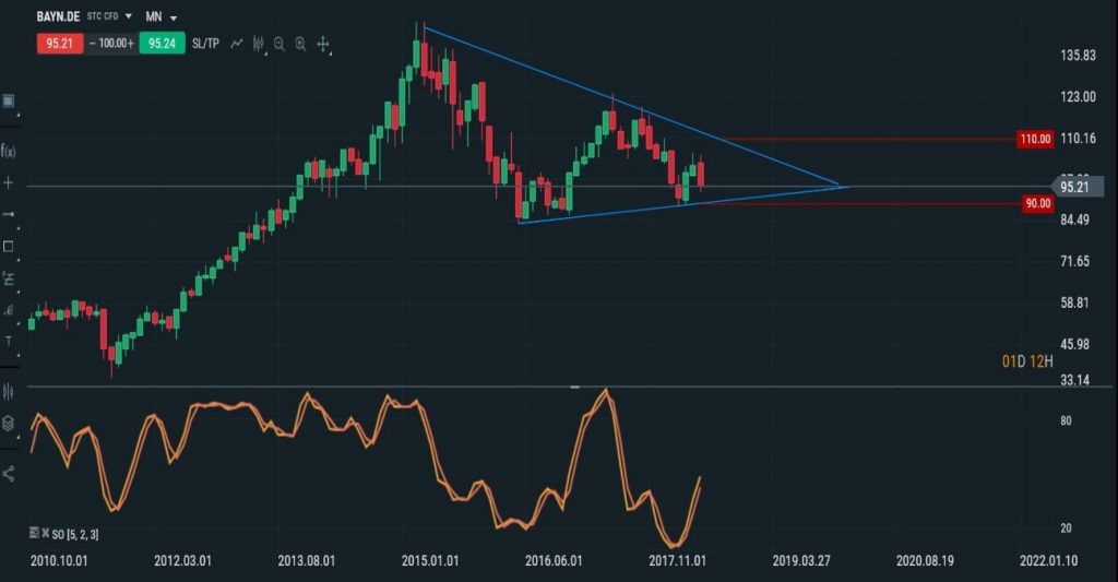Si esto es así, y el precio en el futuro llega a tocar los 110€ coincidiendo con la resistencia del triángulo, habría que ser paciente y confirmar el rebote o la perforación. De existir rebote a la baja, en caso de estar dentro comprado mejor deshacer órdenes, si no estamos dentro la opción es entrar en cortos aprovechando la confirmación del rebote para posicionarse bajista. Pero, si después de todo se confirma una rotura de la resistencia y por tanto la cotización está por encima de 110€ al menos un 2% podríamos deducir con mucha seguridad que el precio de cotización de Bayer podría ascender a nuevos niveles como: 120€ y 145€.