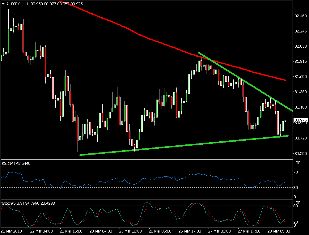 El pasado 23 de marzo del 2018 el par AUD/JPY comenzaba un rebote intentando romper la primera resistencia de la media móvil de 200 sesiones marcada en color roja, sin embargo, ésta actuó cómo zona de resistencia en un primer intento y se encuentra en fase descendente por el momento indicando tendencia bajista.