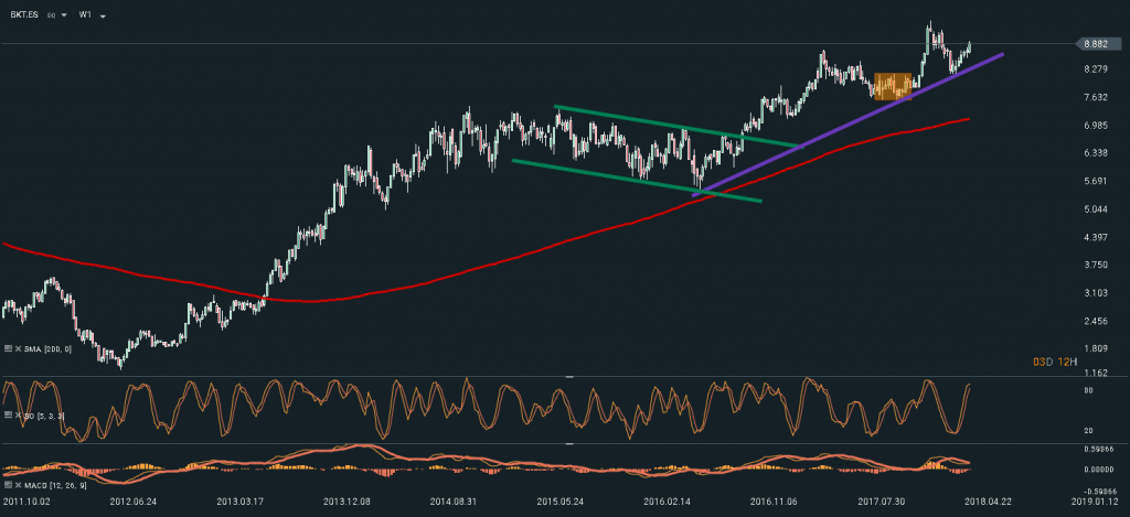 Actualmente Bankinter se encuentra en fase de rebote técnico tras apoyarse en la directriz alcista marcada en color morado. Luego es interesante observar en gráfico diario cómo también se ha apoyado en la media móvil de 200 sesiones para seguir con la subida.