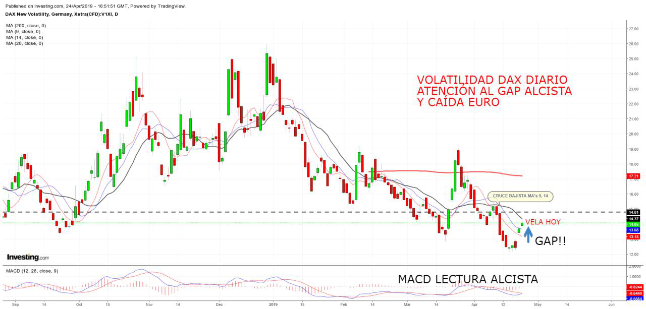 La sesión del miércoles en Frankfurt fue curiosa, mientras caía la divisa de la eurozona, la bolsa de Frankfurt no se daba por aludida y aguantaba los soportes; incluso a pesar de un gap alcista de volatilidad en el selectivo alemán. Pero ayer jueves, la lógica volvió al mercado y el DAX empezó a recortar.