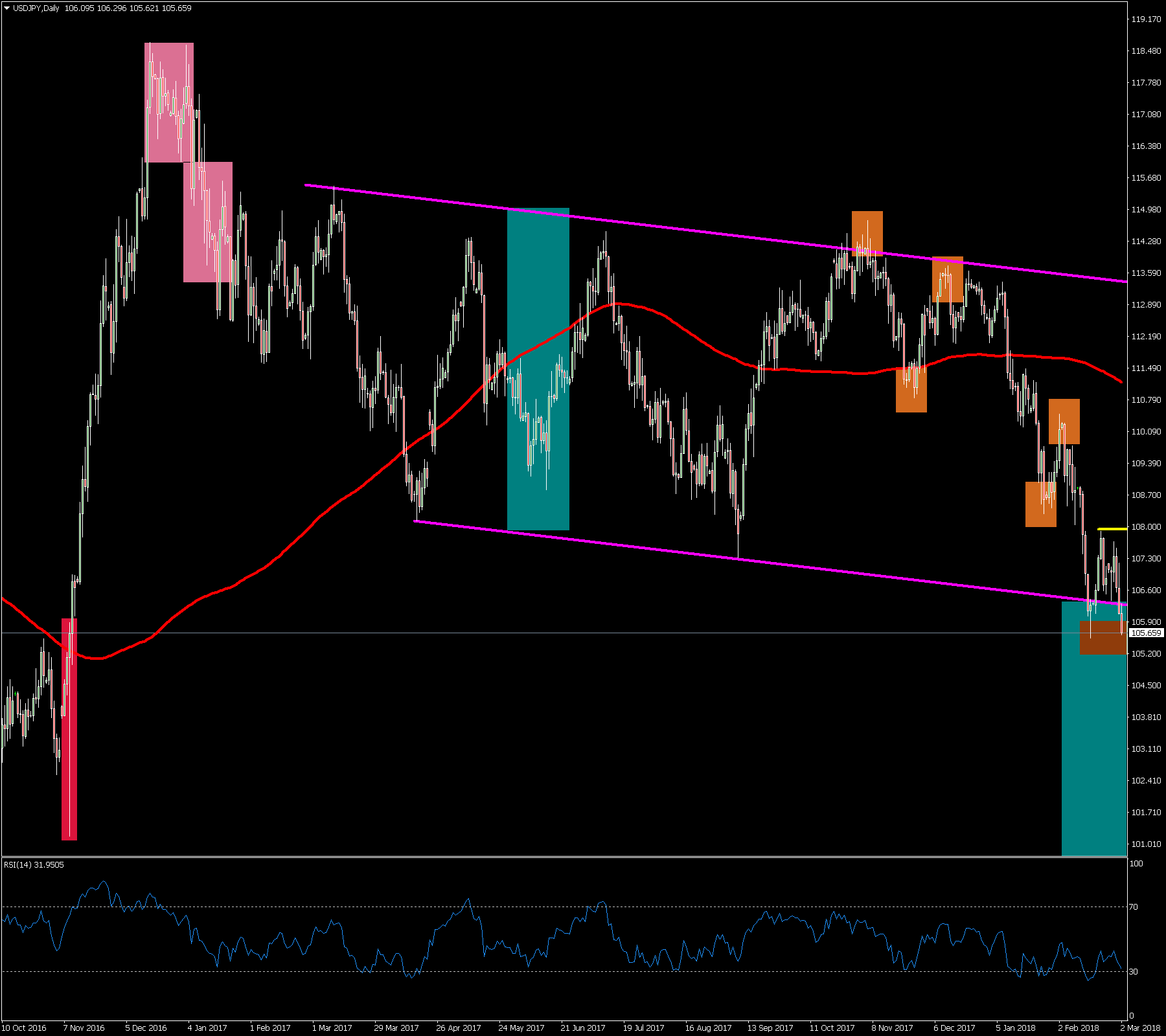 A principios de noviembre del 2017 el cruce comenzó una tendencia bajista formando una consecución de máximos y mínimos decrecientes señalados en color naranja. En el caso de que el par rompa los mínimos del pasado 16 de febrero del 2018, dejaría otro máximo decreciente en la zona delos 108.00 marcado en color amarillo.