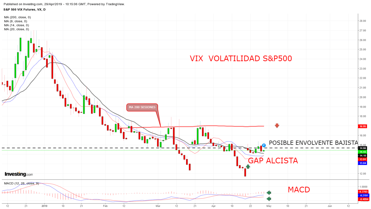 Como muchos de ustedes saben, este índice hace referencia a la volatilidad o incertidumbre en el mercado; representado por la oferta y demanda de opciones put o bajistas. Precisamente, el viernes este índice – VIX – formó una envolvente bajista que, en el momento de escribir este artículo (lunes tarde) todavía no se ha activado.