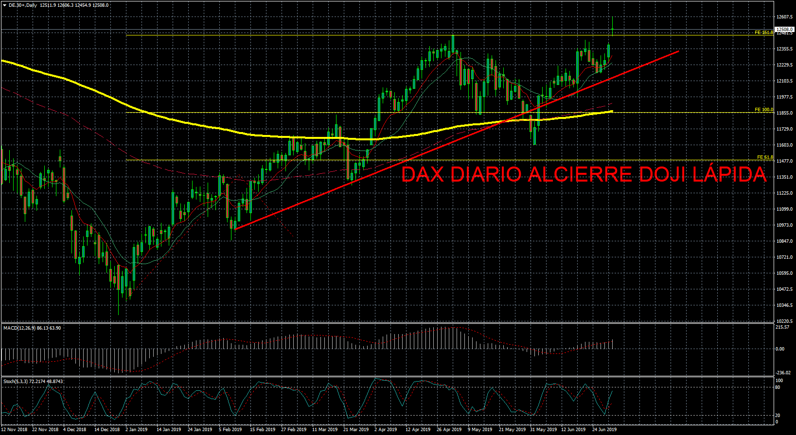 No obstante, en el largo plazo sí que mantenemos nuestras esperanzas en el rally alcista del DAX. Si recordamos, teníamos pendiente una envolvente alcista en el chart mensual. Y, tal y como nos muestra el gráfico de mes, está se ha formado correctamente y, de momento, parece activada si nos fijamos en la apertura del lunes 1 de julio. Desde el punto de vista técnico y por patrones – hablamos del DAX uno de los instrumentos más líquidos que existen –sería difícil que no se activase dicho patrón envolvente alcista. De todas formas, recordamos que estamos en el largo plazo y que, el mes de julio es el peor en cuanto a liquidez se refiere para el DAX alemán debido a las vacaciones de verano.