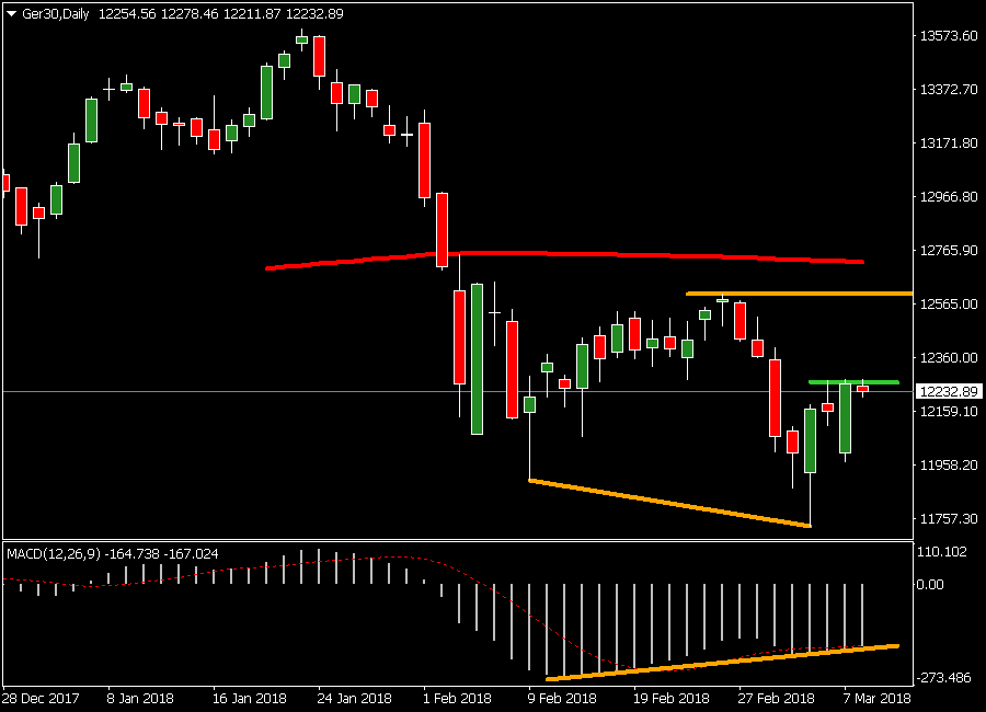 Resistencia a vigilar en los máximos del pasado 26 de febrero del 2018 en los 12.600 puntos, de romper este nivel el índice alemán activaría divergencia alcista con el oscilador MACD, vemos cómo el precio forma mínimos decrecientes marcados en color naranja mientras que en el MACD se pueden marcar mínimos crecientes. Es una contradicción entre el precio y el oscilador e indicaría un posible cambio de tendencia de superar dicha resistencia.