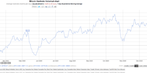 Miércoles por la mañana análisis técnico del Par BTCUSD. Sigue perdiendo momentum aunque se mantiene alcista. El ADX sigue cayendo aunque ciertamente las MA’s continúan con trend al alza. Observamos la tasa de hash o potencia de cálculo y vemos que, aunque describe un triángulo ,que quizás sea alcista algún día, hoy cae.