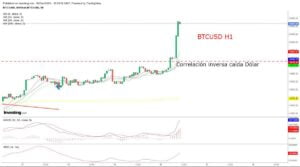 Y eso es exactamente lo que ha pasado. Como se puede comprobar en el gráfico de arriba la caída en una hora de 320 pips del DXA ( Dollar Index ) ha repercutido en una subida parabólica del par BTCUSD como se puede ver en el siguiente gráfico del activo BTCUSD en intra día.