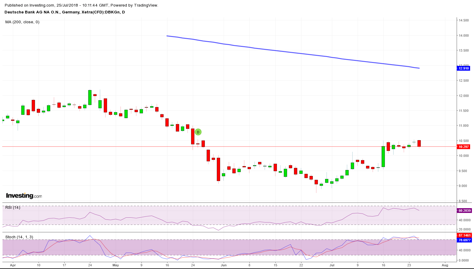 Gráfico diario de Deutsche Bank. Observen la vela bajista dos horas después de presentar resultados trimestrales