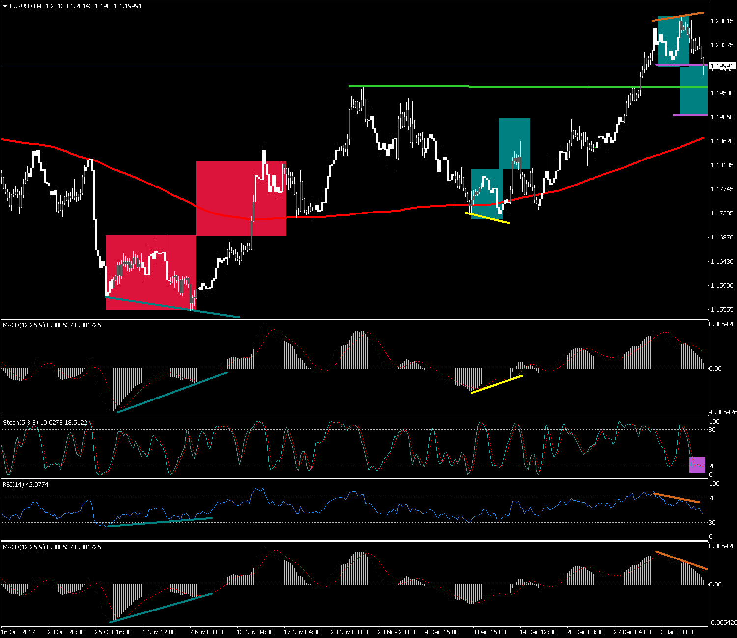 El pasado 13 de diciembre del 2017 el EUR/USD volvía activar otra divergencia alcista, esta vez más pequeña en la zona de la media móvil de 200 sesiones, vemos cómo el precio forma mínimos decrecientes en amarillo mientras que en el MACD son claramente mínimos crecientes.