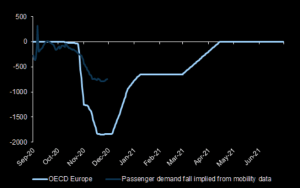 Ayer se pronunció la Organización de Productores y Exportadores de petróleo con un aumento de medio millón de barriles / día a partir de enero de 2021 que se irá revisando. Esta resolución abunda en la falta de acuerdo en la Organización y, en especial, en que no son capaces de presentar unas previsiones de demanda definidas, ante la situación bajista / lateral de demanda de destilados en EEUU ( Gasolina), publicada ayer, la situación de backwardation ( cotización del futuro por debajo del contado) de los futuros USO de crudo EEUU  y el “parón” de demanda de petróleo que muestra Europa según el gráfico siguiente de Goldman.