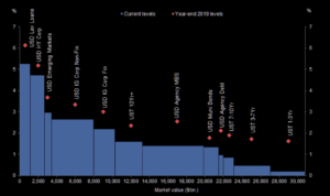 Por contra Marco Kolanovic (su último hito en el análisis de mercados ha sido la ruptura histórica del índice NIKKEI japonés anunciada en septiembre) ve en las ayudas económicas, la intervención de la FED y las vacunas, catalizadores suficientes para una subida sostenida a la vez que una caída de los Bonos ( abaratamiento de Bonos subidas de yields) prefiriendo los corporate frente a los estatales. Por el momento su tesis, o “profecía” auto cumplida, dado el predicamento que tienen sus análisis en el mercado, se está cumpliendo si observamos el siguiente gráfico dónde se aprecia la búsqueda desesperada de yields por parte del mercado ante la reducción de estas en comparación con el 2019.