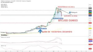 Por A. técnico y chartista, si se cumple el patrón, vemos que la proyección nos llevaría a nuevos máximos del activo. Pero, evidentemente, como en cualquier activo o materia prima – hay que tratar al BTC como una commodity virtual ( como señala la Commodity Futures Trading Commission en sus papers https://www.cftc.gov/LabCFTC/Primers/index.htm) – no todo es el A. Técnico.