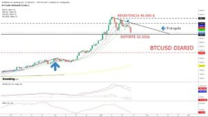 En este caso, el triángulo tiene un lado de proyección – que marca la volatilidad – muy amplio, formado por un antiguo patrón alcista de “tres soldados” y su vela de confirmación posterior que marcó máximos en el BTCUSD.