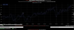 BTCUSD bajista, perdiendo -6%, hacia el soporte del triángulo en 32.000$. La caída coincide con una pérdida de -5% en la tasa de hash en las últimas 24 horas a la vez que, la tasa de dificultad sigue alcista como se puede apreciar en el gráfico siguiente.