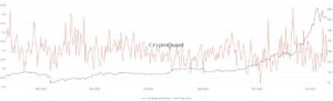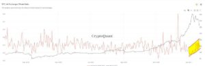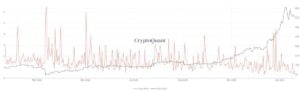 El gráfico de arriba, All Miners to All Exchanges Flow Mean, muestra un amento de las ventas por parte de los mineros en las últimas 24 horas. Por el momento, no han llegado al máximo de ventas de la semana que tuvo lugar el domingo. Es lógico que si la tasa de dificultad escala y la potencia de cálculo o tasa de hash no está a la altura, como hemos visto en el gráfico anterior, los mineros venden en un escenario de liquidez y bajas expectativas de rentabilidad. Por el momento, no son grandes ventas.