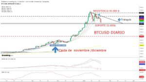 Cuando ahora, esta situación tiene lugar en bajadas, estas se acentúan. La clave será cuando se teste el soporte de 32.000$ ( base del triángulo). Si el testeo llega con hash a la baja, podemos tener rupturas del soporte y crisis para la trend alcista. Esto, desde el punto de vista chartista, constituiría una falsa ruptura del triángulo. ( Pueden repasarse triángulos de commodities como el Oro en charts Diario y Semana).