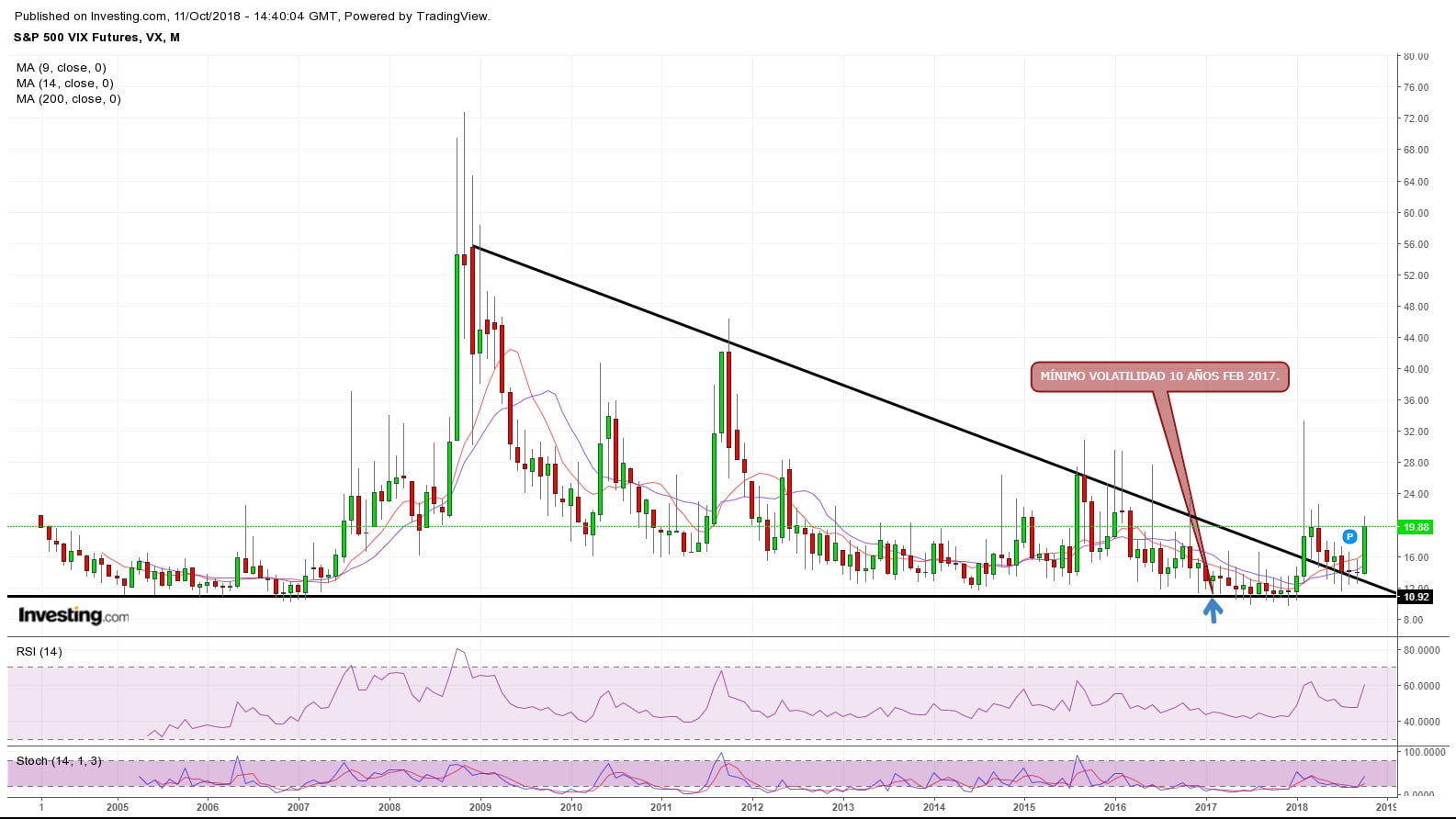 Chart largo plazo VIX (volatilidad) Puede observarse como desde el mínimo en feb 2017. La volatilidad de los índices bursátiles ( S&P500) vuelve a expandirse.