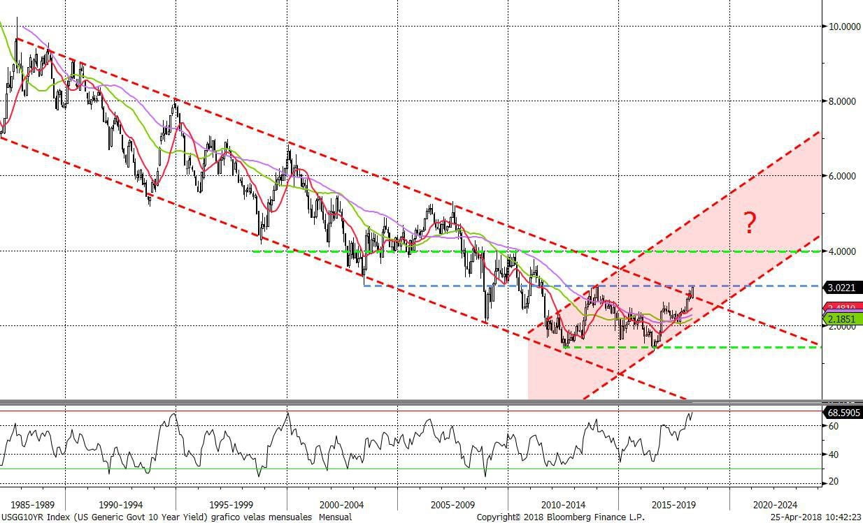 Canal bajista de 30 años de duración del tipo de interés del Bono Treasury a 10 años. Actualmente ( 11/10/2018) ya cotiza por encima del 3’18 %.