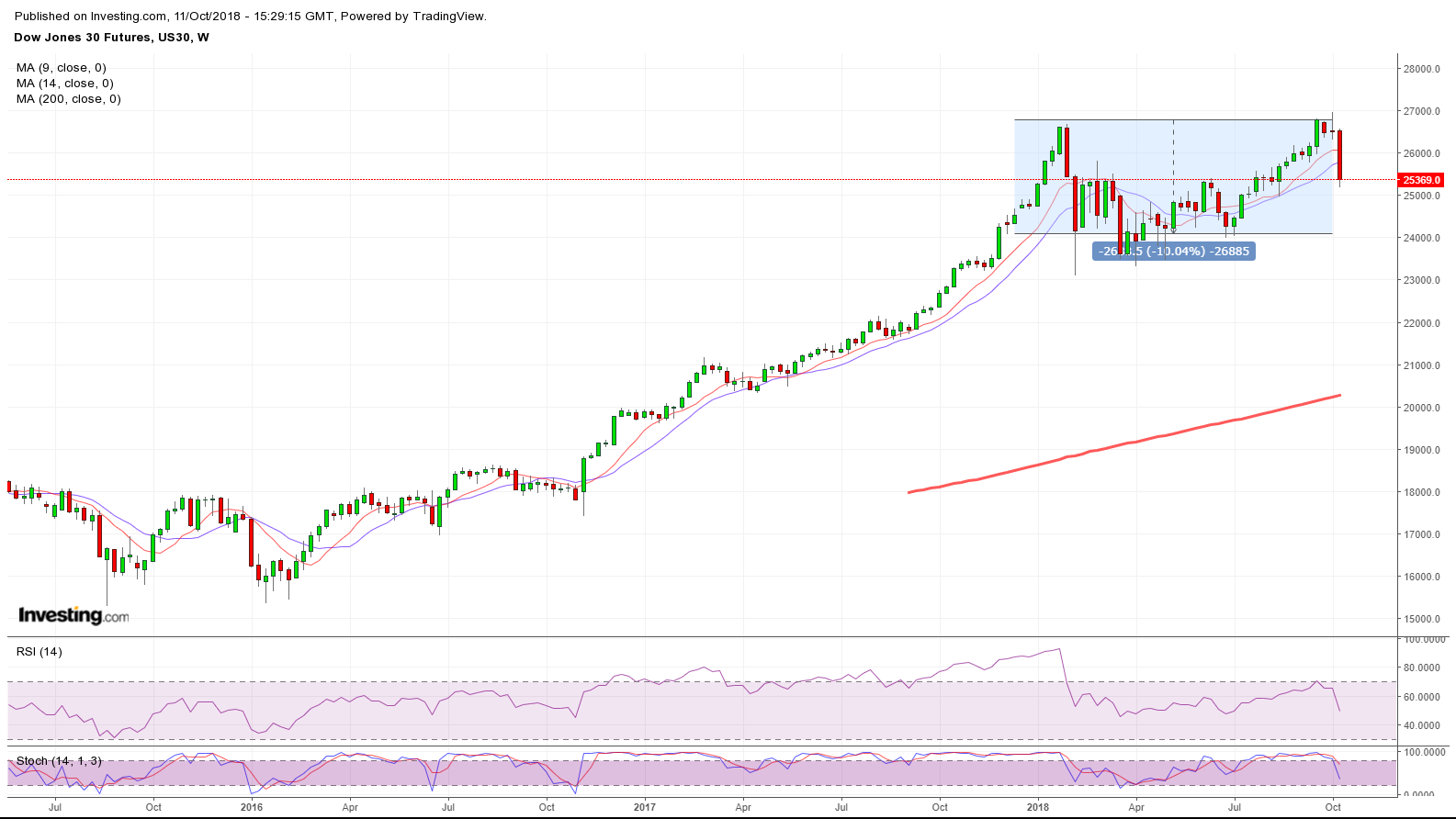 No lo sabemos por que el análisis técnico no sirve para predecir ,si no para mostrarnos cuales son los patrones o comportamientos del mercado y de los inversores; y en base a este, hacer nuestro trading a favor de dicho mercado y de la tendencia principal. Como hemos escrito en el artículo “momentum en el mercado de divisas” del pasado 9 de octubre, es el principio del fin. Estamos ante la etapa final de una tendencia, que como sabemos es la distribución, momento en el que la tendencia entra irremediablemente en sobre compra y las ventas son cada vez más acentuadas e irreflexivas, dando lugar a la subida de volatilidad que estamos viviendo estos días. Desde el pasado mes de febrero/ marzo, estamos ya en el tercer episodio de sell off de acciones que además coincide con la resaca de la subida de tipos en EEUU y la presión alcista del Bono USA a 10 años que se sitúa muy cerca del 3’2%, consolidando así la ruptura de la resistencia de un canal bajista de tipos de 30 años de duración.