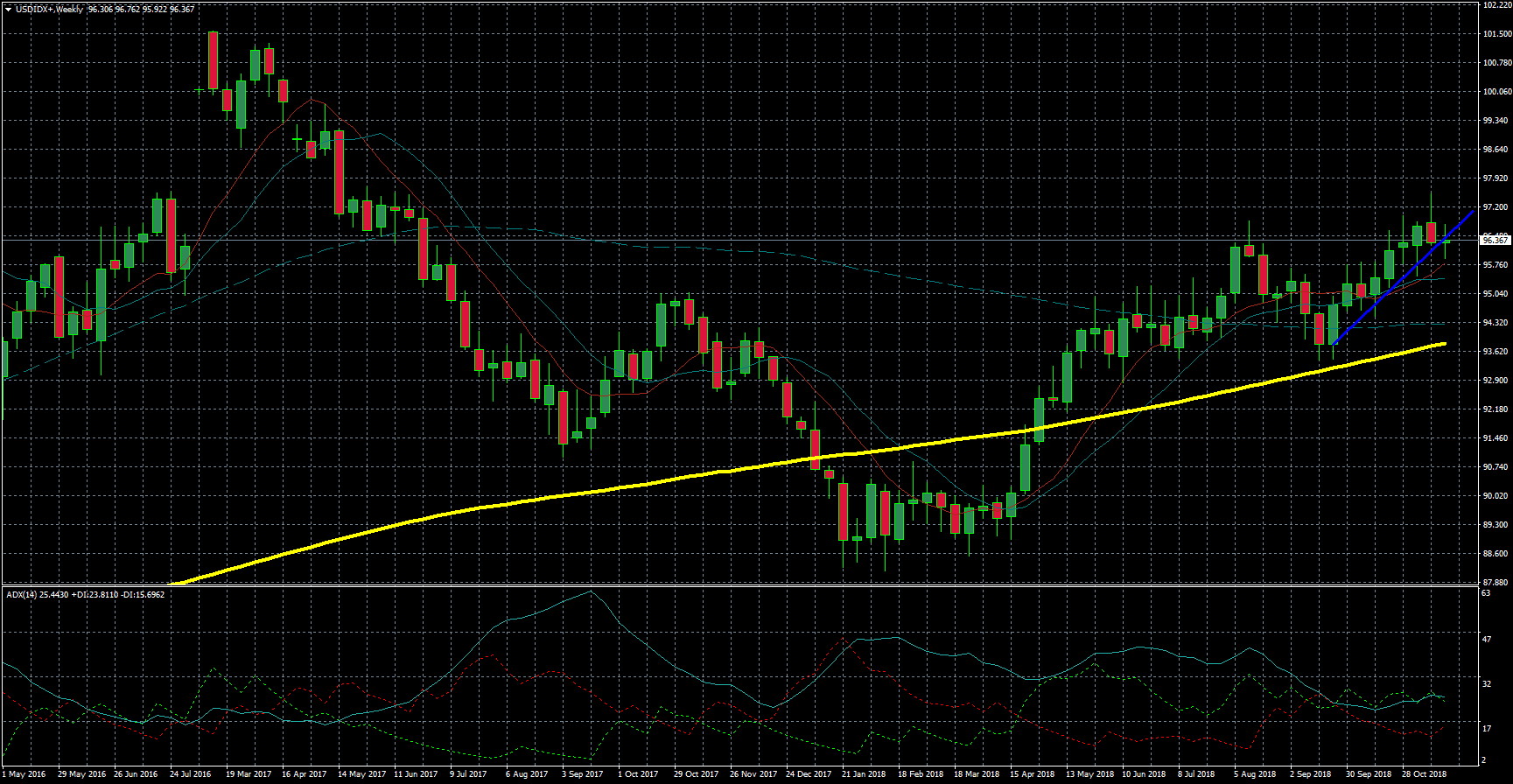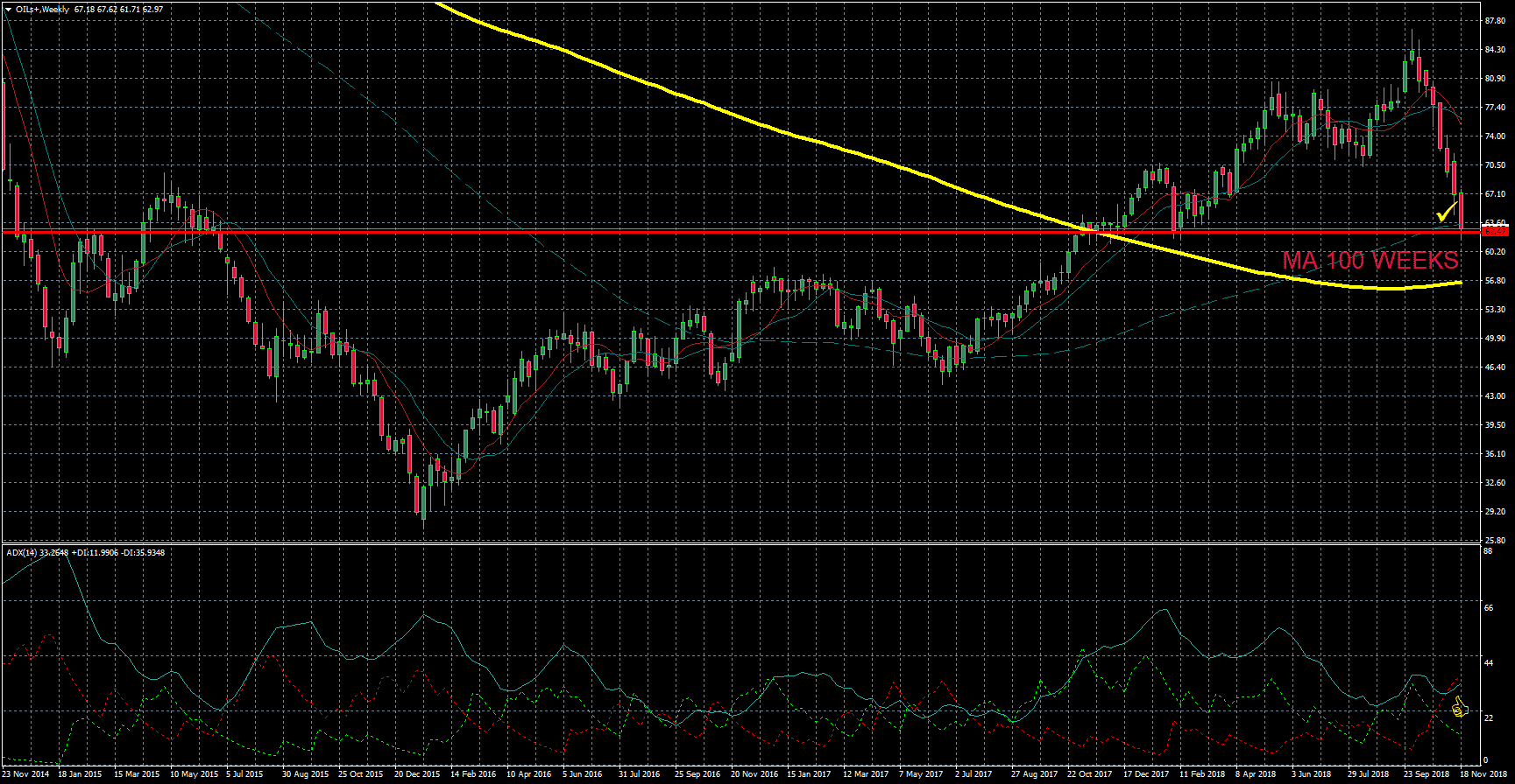 OIL + Semanal (Jueves 12’00 AM). ADX indica Trend bajista fuerte. La pérdida de la MA 100 enfrentaría al Barril con los 60 $.