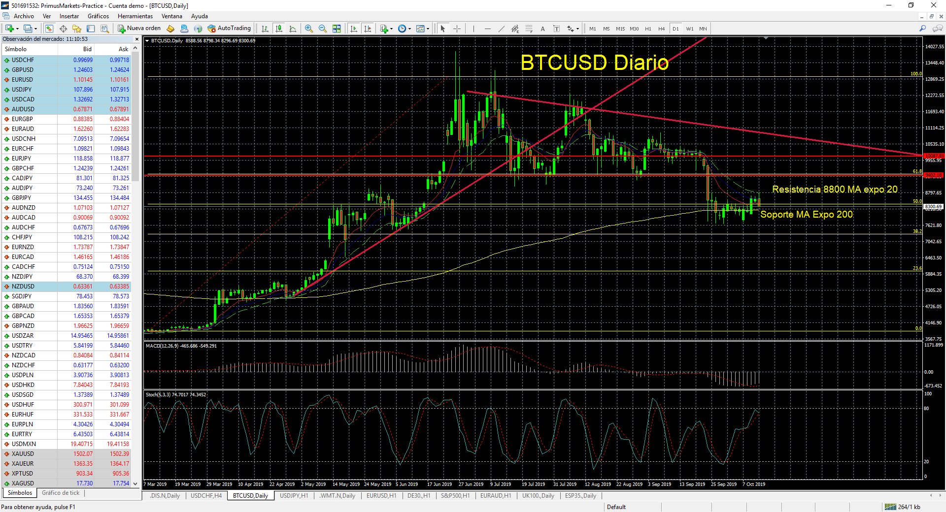 Por último, atentos también al par BTCUSD que vuelve a reaccionar en el entorno de los 8300 $ en la MA Expo de 200 sesiones. Al alza descartamos cualquier entrada si no se supera la Resistencia de MA expo 20 Sesiones en 8800 $. Mientras que un retroceso de la cripto moneda de referencia podría romper soporte de 8160 $ y testar los 7.300 $ en el soporte / nivel Fibonacci de 38.2