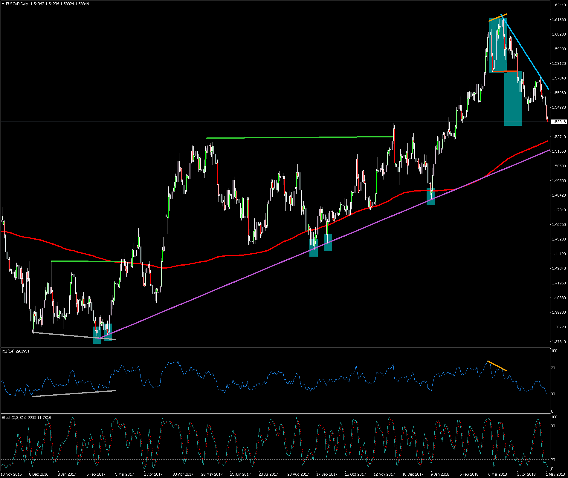 A principios de abril del 2018 el EUR/CAD perdió el soporte de los 1.5750 activando divergencia bajista marcada en naranja con el oscilador RSI. Luego el posible objetivo por divergencia bajista está muy cerca de cumplirse en 1.5350.