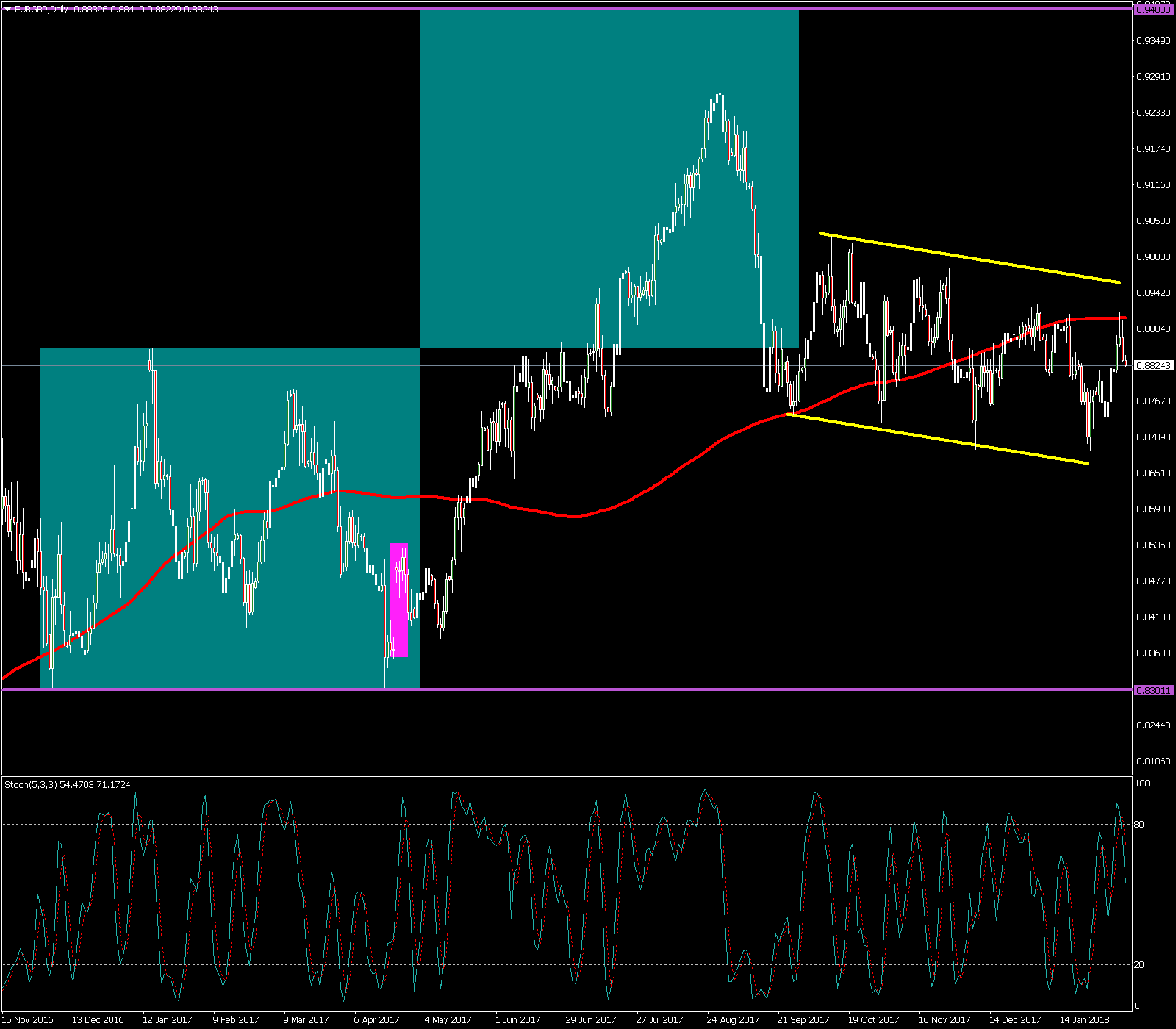 A finales de agosto del 2017 comenzó una corrección desde máximos anuales en la zona de los 0.9300, llegando a caer hasta la zona de la media móvil de 200 sesiones marcada en color roja. Tras apoyarse en la media móvil de 200 sesiones el cruce se encuentra consolidando en un gran canal bajista marcado en color amarillo.