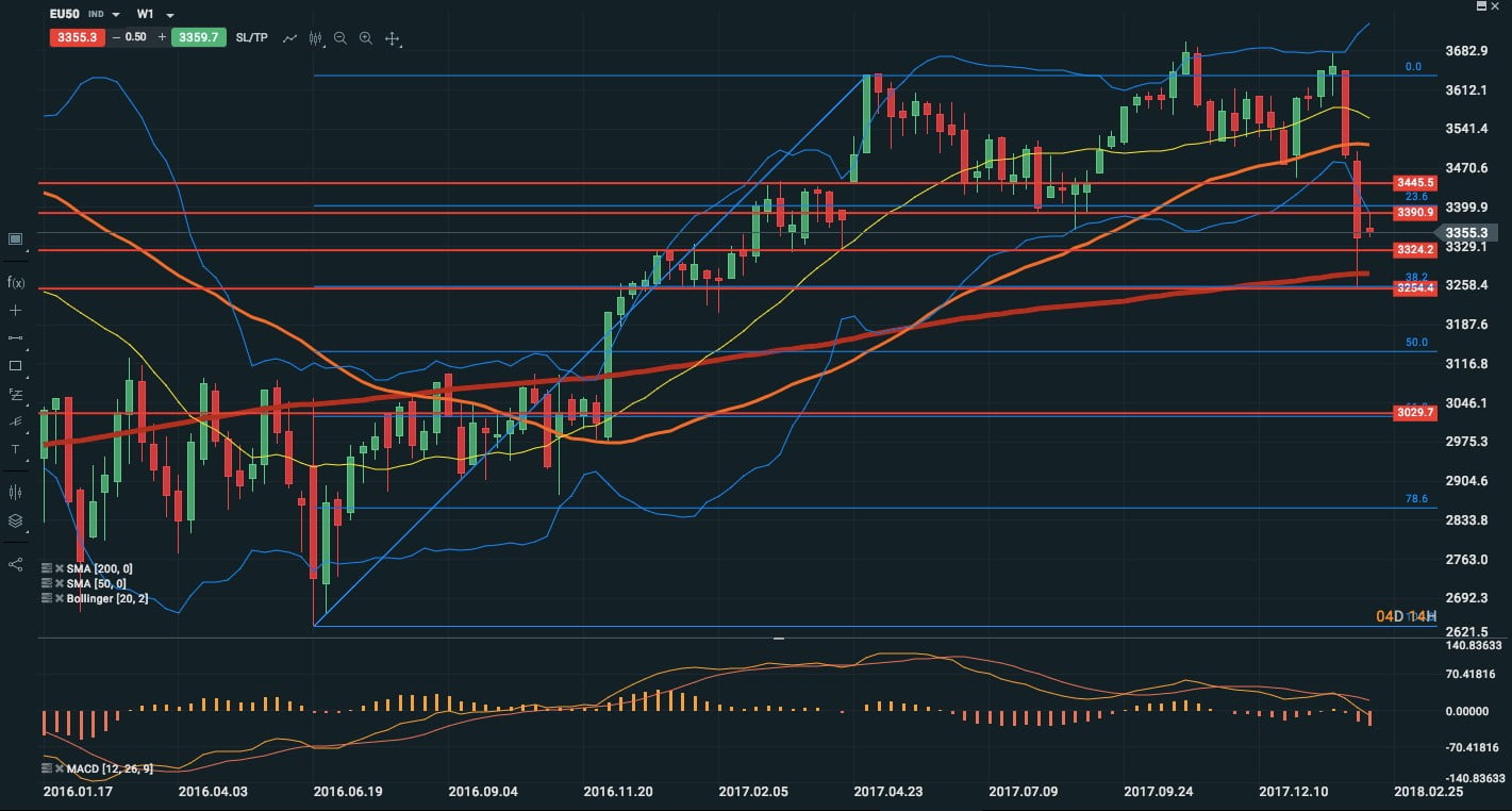 En el gráfico semanal del Eurostoxx 50 se puede observar un canal lateral des del pasado día 23/04/17 hasta el 04/02/18. En esta última fecha, el índice rompió por la parte del soporte aproximadamente en los 3.390 puntos hasta llegar a los 3.360. Se puede observar un rebote en la media de 200 sesiones que coincide con un soporte en gráfico mensual (de un doble techo anterior) y el 38,2% de Fibonacci. Estas tres “coincidencias” indican un fuerte soporte difícil de superar solamente por técnico. De todos modos, como ya se ha comentado anteriormente, si sale una noticia de fuerte impacto o el bono sigue cayendo podría darse esta tesitura.