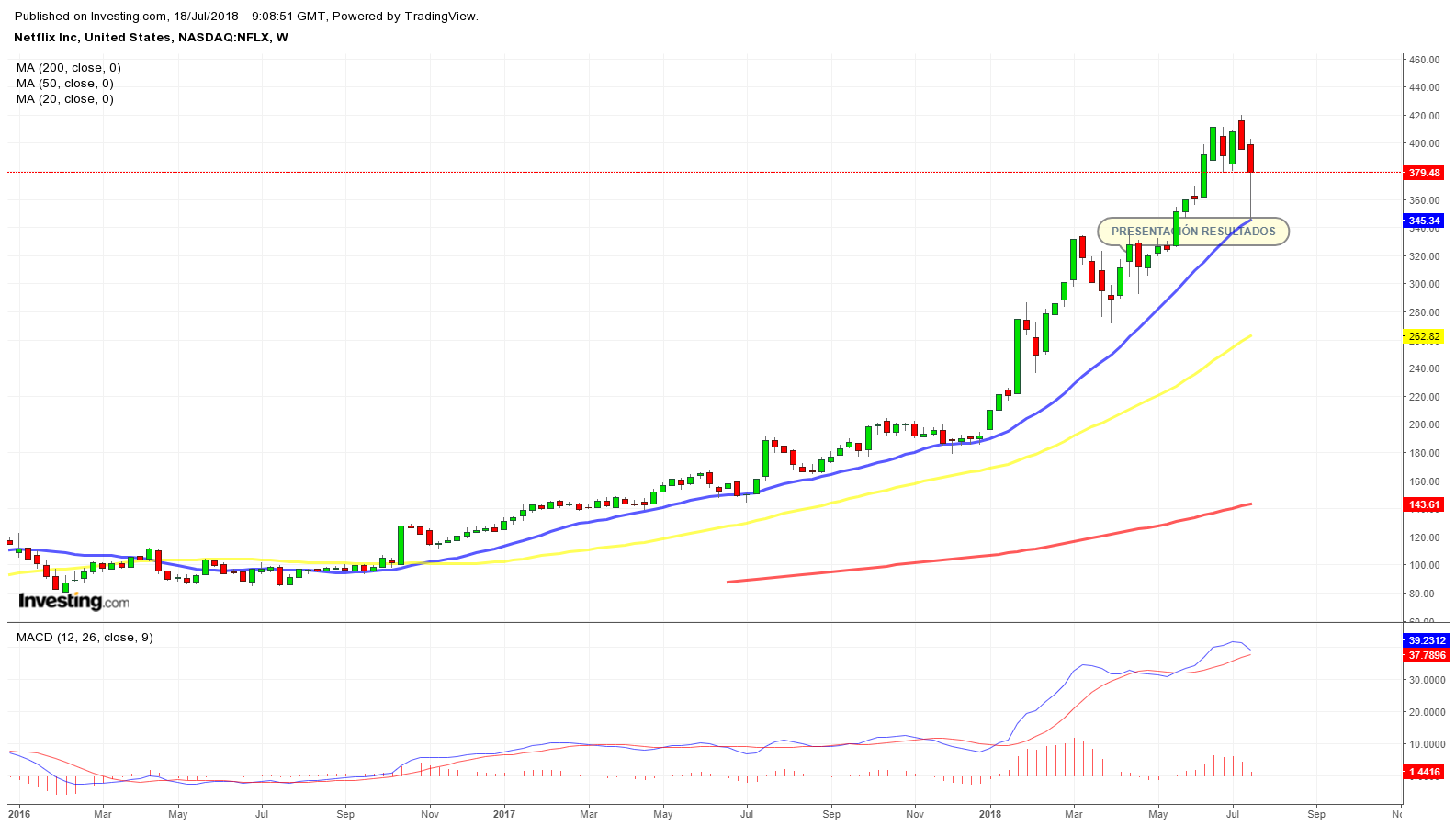 La caída de la plataforma audiovisual que recogía el consenso de analistas se sitúa en un -30% con un precio objetivo de 360’11 $ por acción. Situándose, si se cumple la previsión, en el precio de hace 5 semanas. El cierre del 17 de julio fue de 379’48 $ acción.