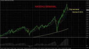 Por el momento las Medias móviles nos indican volatilidad pero no sesgo claro; no así el MACD que se muestra en conjunto bajista. La volatilidad del Nasdaq también es un misterio por la falta de sesgo claro desde que hace quince días rompió el sesgo alcista pero, desde entonces la mencionada volatilidad cambia con cada sesión ante el nerviosismo de los que cubren carteras y de la necesidad de brokers para cubrir las posiciones, cada vez con menos sentido si lo tuvieron alguna vez, de las calls de corto plazo de especuladores.
