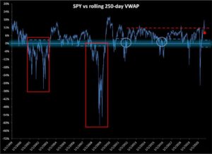 Para los que creen que el soporte está por encima de 3.200 ptos, el dato de salida del S&P 500 de zona sobre compra máxima ( el mayor nivel en la década, indicado en el siguiente gráfico) les dará esperanzas. No obstante, el mejor dato, para traders e inversores es esperar al precio de lunes.