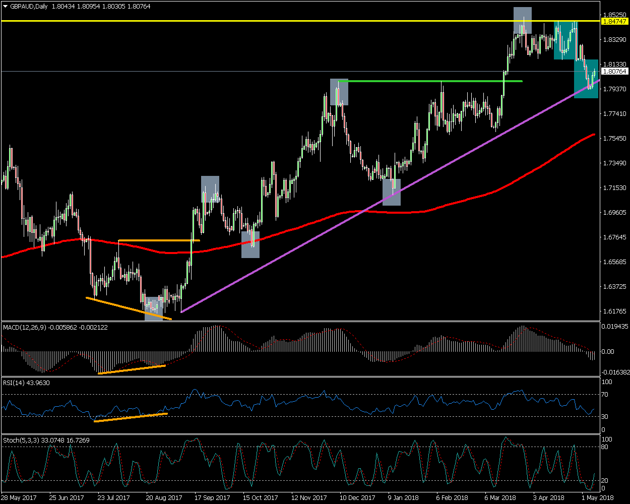 Actualmente el cruce está consolidando o en un fase correctiva, el pasado 27 de abril del 2018 activó un doble techo señalado en azul con posible objetivo a la baja hacia los 1.7850, veremos si la cumple o la anula en el futuro.