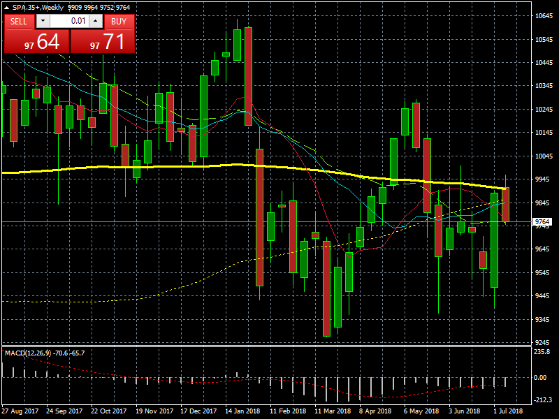 GRÁFICO SEMANAL IBEX 35. DESDE QUE EN PRIMAVERA PERDIÓ LOS 10.000 PUNTOS Y LA MA DE 200 SEMANAS. LOS 9.900 PUNTOS SE HAN CONVERTIDO EN UNA RESISTENCIA INSUPERABLE PARA EL SELECTIVO ESPAÑOL