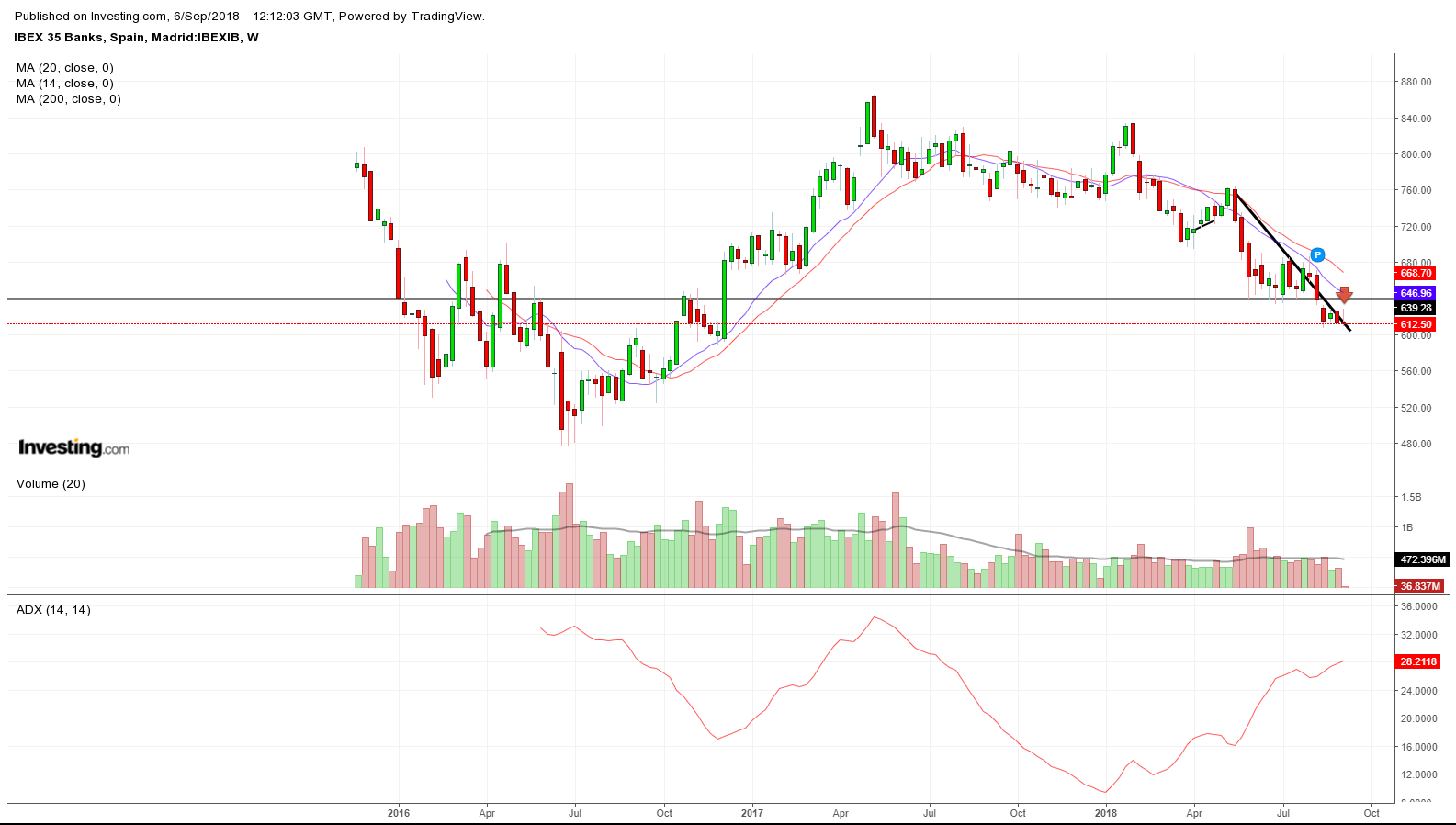 La guerra de aranceles, los malos datos macro de España y Alemania, la debilidad del euro – que perjudica de forma especial a la banca española – además de la crisis de los emergentes ( Turquía, Brasil y Argentina ) que afectan directamente a las entidades españolas internacionales ( SAN, BBVA ) ,han sido los principales responsables de la caída del Ibex ,de la pérdida de soportes y hoy (jueves) , la entrada “oficial” en tendencia bajista según nos marca el oscilador ADX.