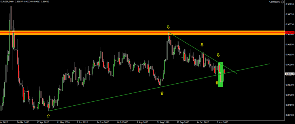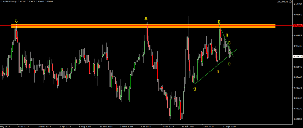 EUR/GBP – ✅ Con una pérdida de unos 160 pips después del 3 toque en gráfico diario mencionado la pasada semana, el par parece que intente recuperar de nuevo zonas de directriz alcista en gráficos superiores (semanal)
