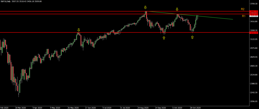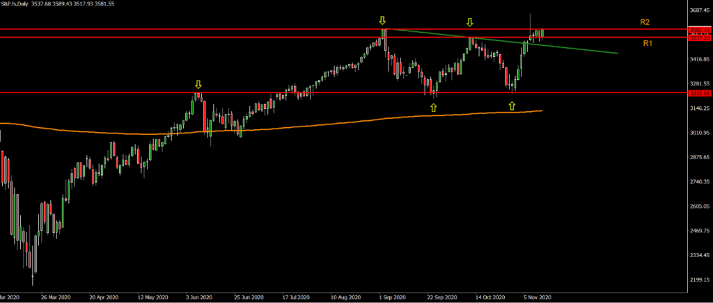 Semana “perfecta” con el análisis (técnico) anterior 100% cumplido. El SP500 llegó a conseguir cotizar por encima de las dos resistencias mencionadas (R1 y R2).