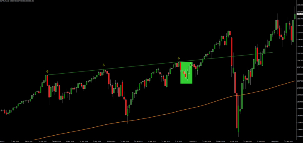 Os dejo un ejemplo de un escenario similar el pasado Julio de 2019 en el que una vez confirmado el tercer toque retrocedió unos 220 puntos en gráfico semanal ⬇️