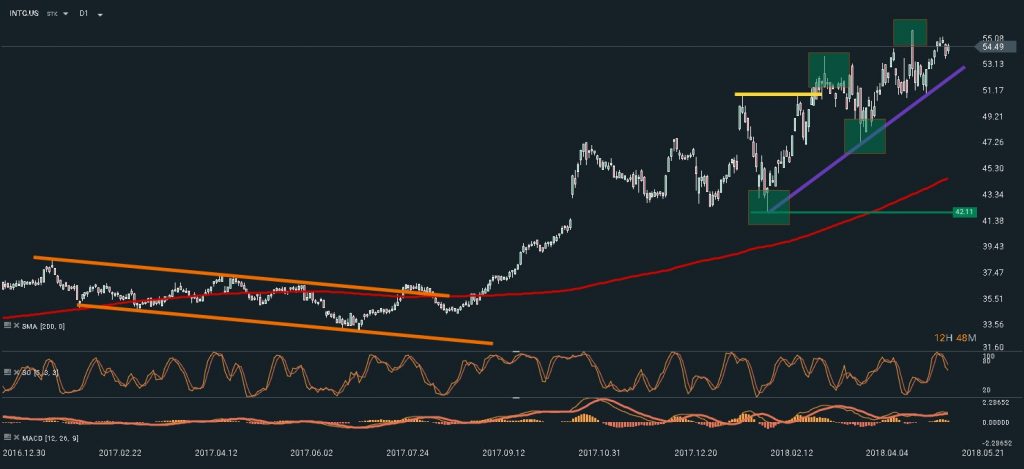 En el corto plazo podemos observar cómo en agosto del 2017 Intel rompió un canal bajista marcado en naranja, el cual se acabó cumpliendo y generó una fuerte tendencia alcista tras su activación.