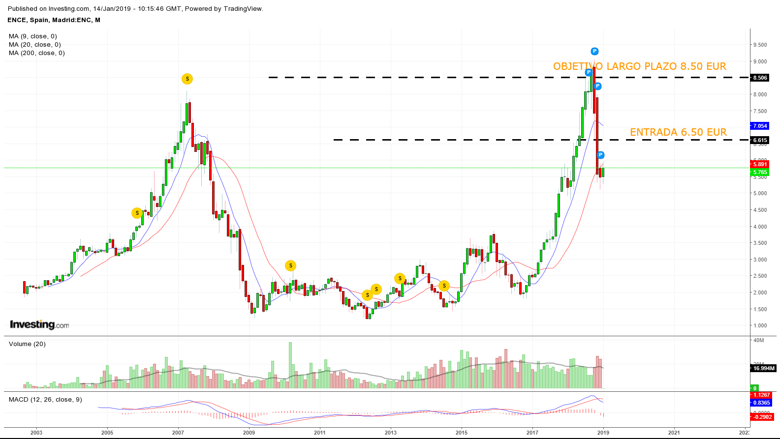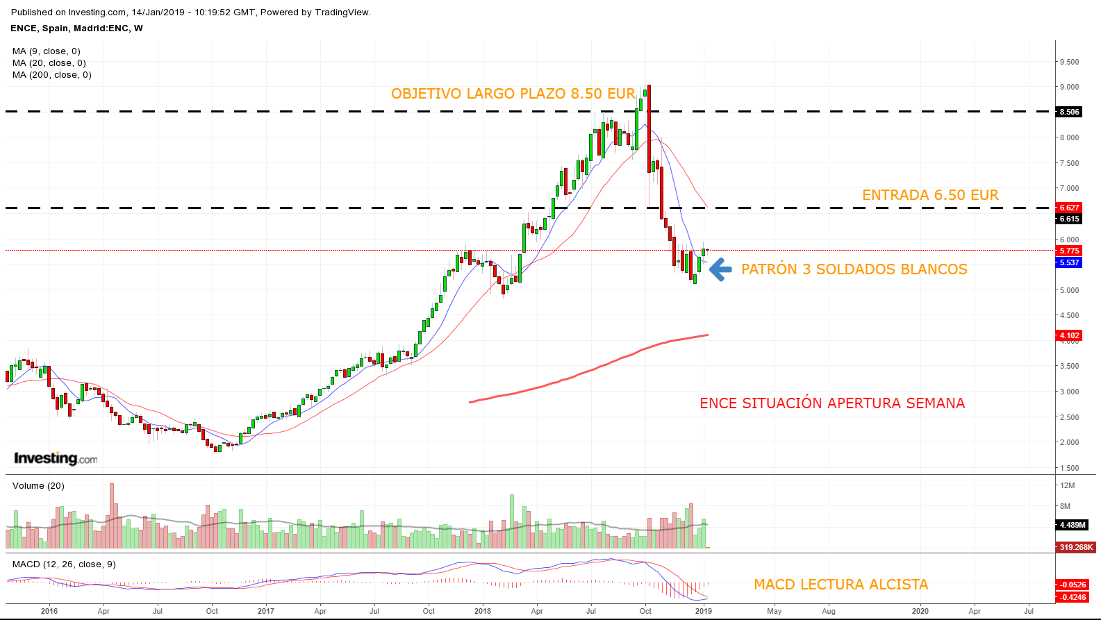 Otros datos para estar pendientes son la presentación de resultados el próximo 26 de febrero y, más importante todavía, la beta – la relación de ENCE respecto al IBEX – de 0.8 del valor que, al estar muy cercana a 1, va a estar muy correlacionada con el riesgo sistémico del selectivo español. El PER o expectativa de beneficios es atractivo, 11.6, y los dividendos se pagaron en diciembre de 2018 con un importe de 0.11 Euros / Acción. Como cualquier valor nuevo en el selectivo, recomendamos paciencia y ser estrictos en lo que le exigimos técnicamente al comportamiento de la acción en el gráfico.