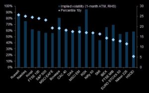 Siguiente gráfico de Goldman, aumento de volatilidad implícita de las acciones por índices comparando con el percentil de la última década ( punto azul).  IBEX 35 de los más altos.