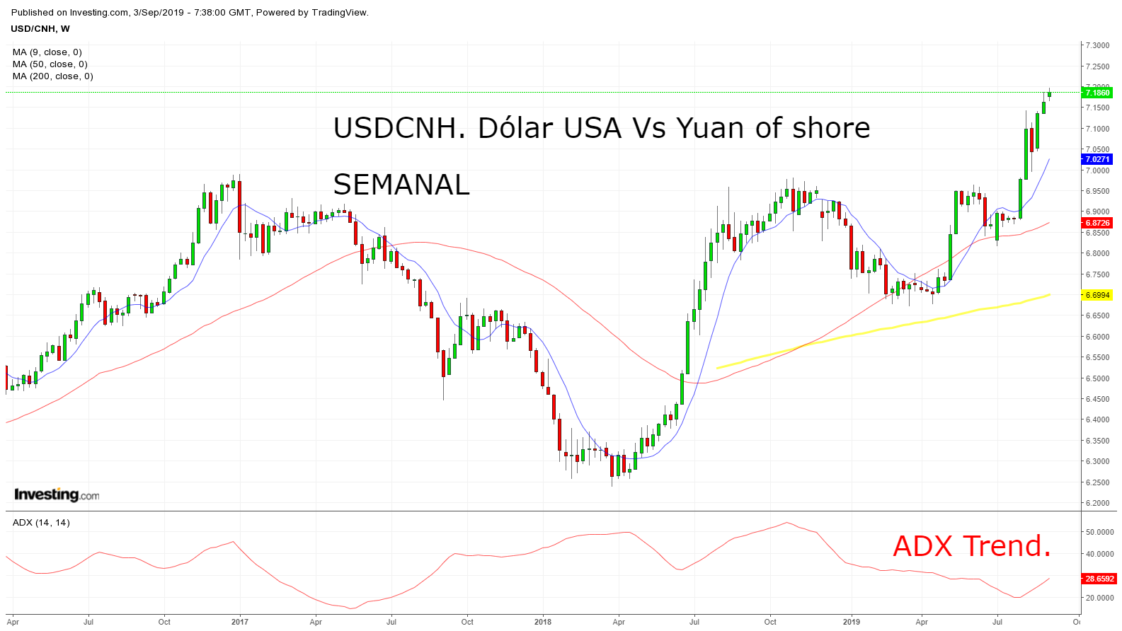 Por ello, cuando en el par USDCNH es alcista, como está ocurriendo ahora (desde agosto) significa que el USD norteamericano se está apreciando frente al Yuan chino. Esto, favorece a las castigadas exportaciones chinas – que disponen de una divisa más barata – y perjudica a EEUU que tiene que lidiar con una moneda cara.