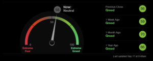 No obstante, no estamos ante un vencimiento normal por la situación de burbuja y sobre valoración; aunque las Big tech siguen bajando sin soporte por debajo de las medias de 20 sesiones y situándose ya en zonas atractivas para compra con descuento. Si realmente el mercado da por buena la “limpieza” de esta semana y la pasada, es posible que no veamos grandes cambios en la sesión de la tarde en Wall St. Esta situación la vivimos ya en marzo cuando parecía que el mercado podría haber encontrado soporte llegó el vencimiento trimestral de entonces y … nada raro ocurrió; es decir el mercado daba ya por buenos los soportes. Semanas después empezamos a vivir la vuelta en V de los índices y el inicio de la gran burbuja que nos acompaña desde la pasada primavera. Por último pero no menos importante; dos indicadores contrarian de sentimiento de mercado que no dan muestras de ruptura por el momento. Uno, el ma´s importante le PUT /CALL Ratio a 5 días que ayer no indicaba grandes cambios y el otro, el sentimiento de mercado de CNN que da  muestras casi de neutralidad en cuanto a apetito por el riesgo se refiere.