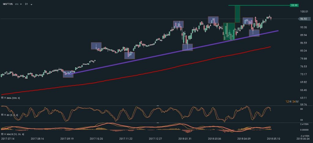El pasado 17 de abril del 2018 Microsoft rompió la resistencia en 95,30 activando figura de cambio de tendencia tipo doble suelo señalada en color verde, con posible objetivo al alza hacia la zona de los 102,80, veremos si la termina cumpliendo en el futuro. La figura sólo se anularia de perder los mínimos del doble suelo en 88,70.