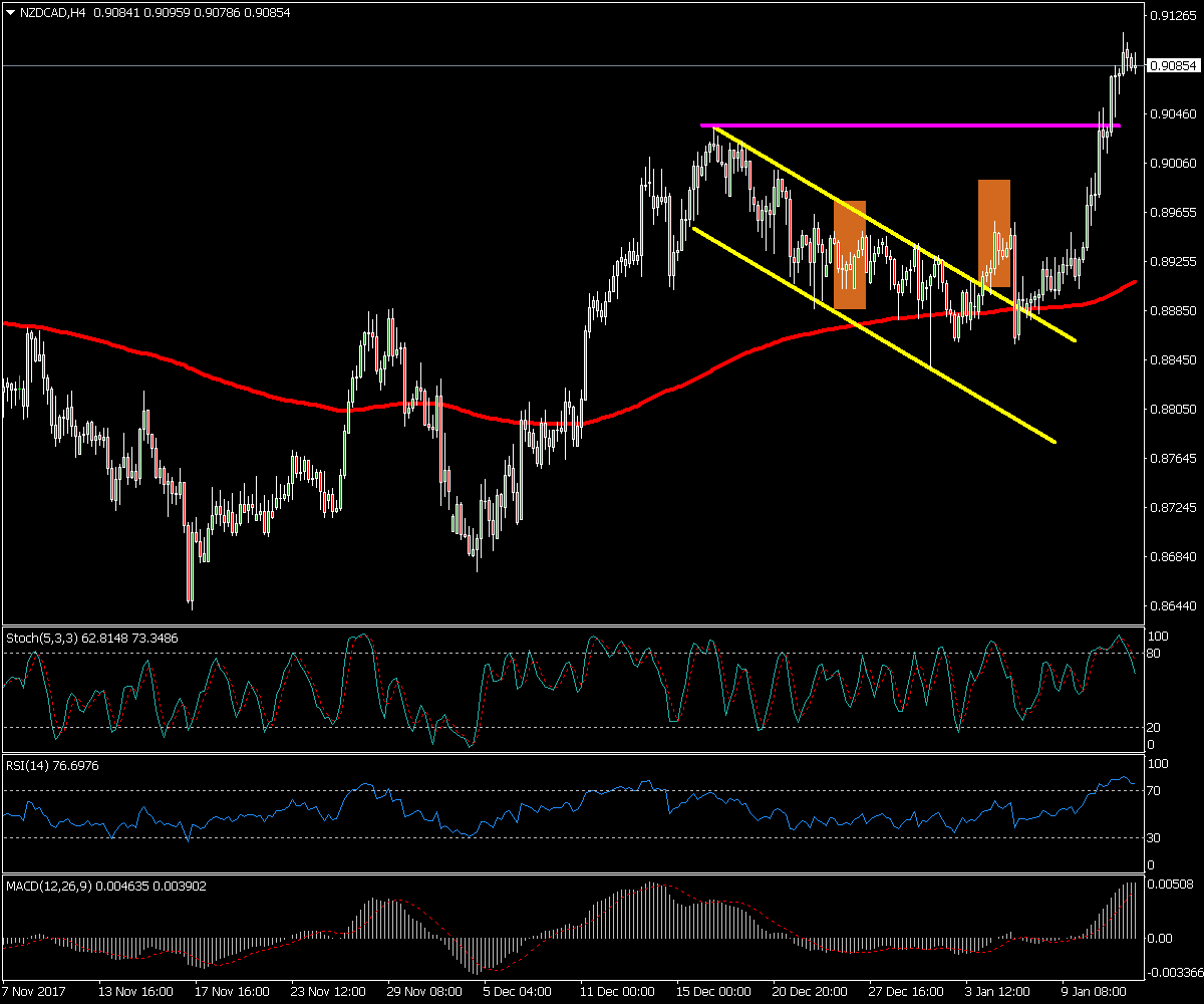 A principios de enero del 2018 el NZD/CAD rompió un canal bajista señalado en color amarillo activando un objetivo alcista de la misma distancia de la anchura del canal, el cual acabó cumpliendo el pasado 10 de enero.