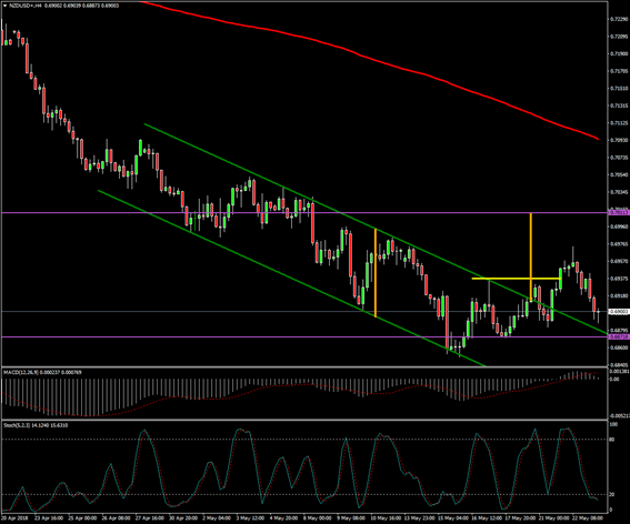 En el muy corto plazo, el pasado lunes 21 de mayo del 2018 el kiwi rompió el canal bajista marcado en color verde activando un posible objetivo al alza por canal bajista roto al alza hacia la zona de los 0.7010, veremos si lo cumple o lo anula en el futuro. Tiene soporte relevante en los mínimos del pasado 17 de mayo en 0.6870.