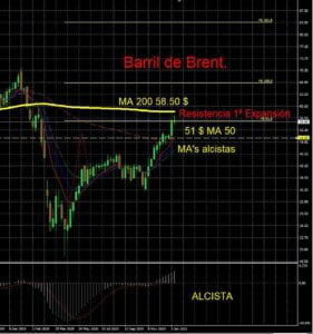 No podemos perder de vista el chart semanal dónde, si observamos, todos los fundamentos técnicos son alcistas. Si la demanda de crudo a largo plazo, o posibles desacuerdos en la OPEP respecto a restricciones de producción, no frustran los factores alcistas técnicos acumulados, podríamos tener rally alcista en el barril de Brent.