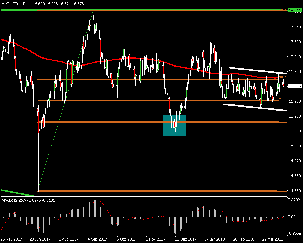 En el medio/largo plazo podemos observar cómo a principios de julio del 2017 la plata tuvo un fuerte rebote hasta la media móvil de 200 sesiones marcada en color roja, la cual actuó cómo zona de resistencia. Luego los precios corrigieron hacia la zona del 61.8% del Fibonacci, cómo vemos señalado en color azul, dónde encontró cierto soporte para volver a rebotar.
