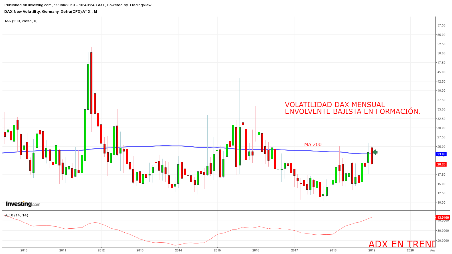 Sobre volatilidad, la situación más interesante la encontramos en el índice de volatilidad del DAX en largo plazo. Dónde una envolvente bajista podría brindar al DAX un escenario muy alcista a medio plazo.