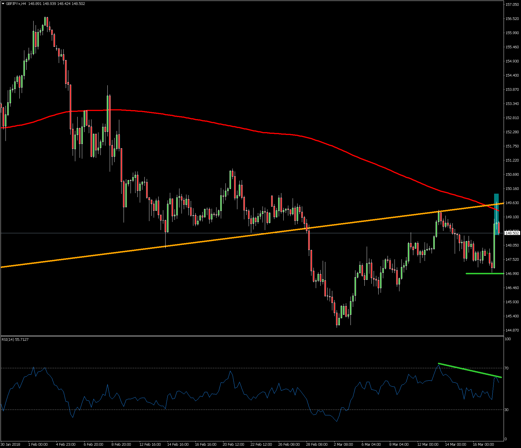 A finales de febrero del 2018 el cruce rompió el soporte relevante en la directriz alcista principal marcada en color naranja. Tras romperse dicha directriz ha pasado de soporte a zona de resistencia formando un Pull-Back. En el cierre anterior en gráfico intradiario de 4 horas podemos ver cómo la paridad ha formado una vela de señal tipo doji lápida señalada en color azul justo por debajo de la directriz alcista principal, indicando cierta resistencia en los máximos de la misma en 149.70.